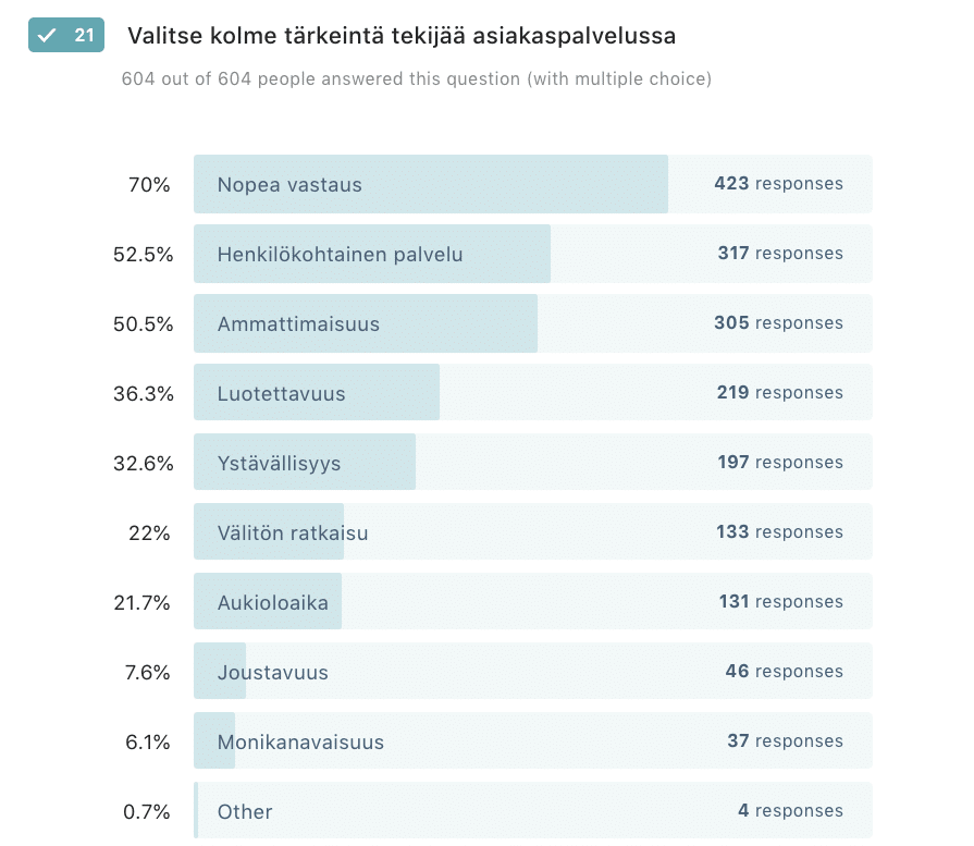 Tärkeimmiksi tekijöiksi asiakaspalvelun onnistumisen kannalta vastaajat kokivat nopean avunsaannin, henkilökohtaisen palvelun sekä ammattimaisuuden. Ratkottavan pulman luonteesta riippuen monet asiat pystytään selvittämään puhelimessa välittömästi, mutta esimerkiksi sovelluksen ominaisuuksia koskevat sähköpostiyhteydenotot saattavat joskus vaatia syvällisempää tutkimista.